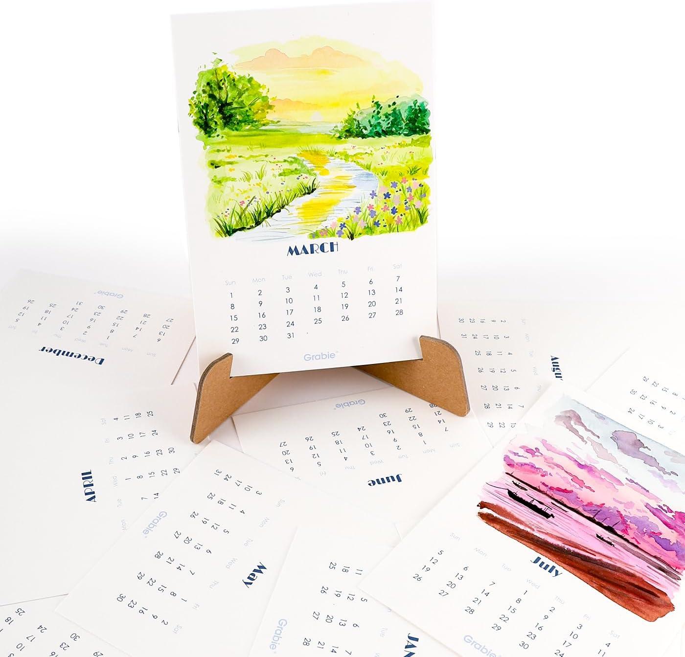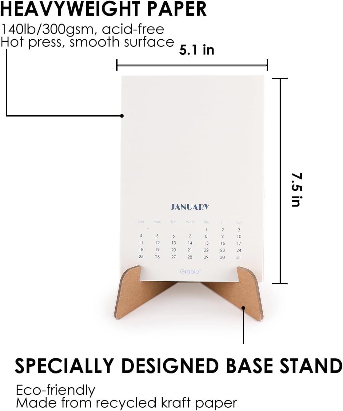 Grabie 12-Month Watercolor Calendar Set for 2026, Premium Paper, Sturdy Kraft Stand, 100% Cotton Paper, Acid-free Smooth Texture (Hot Press), 140 LB (300 GSM), 12 Sheets/Pack, Art Supply for Watercolor Creative Crafts and DIY Medias