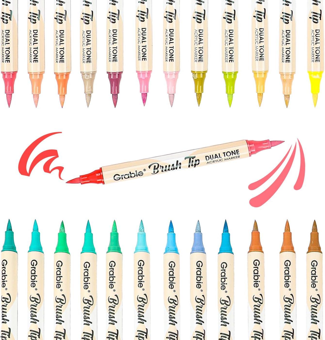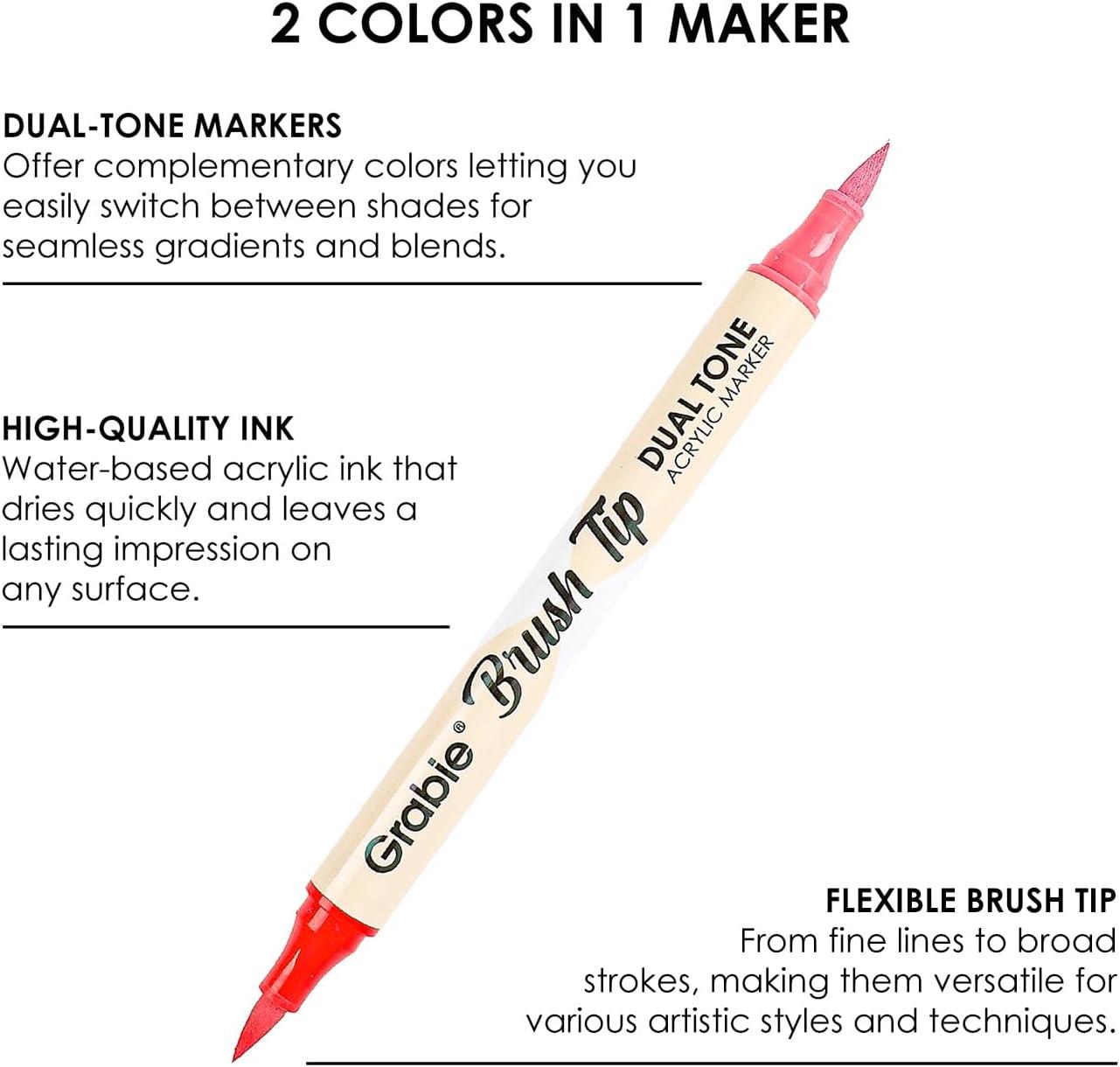 Experience the versatility and vibrancy of the Grabie 2-in-1 acrylic marker Set. With dual-color brush tips, this innovative design offers a wide range of colors in one convenient set. Crafted with premium acrylic paint, these markers are non-toxic, quick-drying, and perfect for any surface. Whether on paper, stone, glass, or beyond, Grabie markers deliver bold, vivid colors and superior performance with every stroke