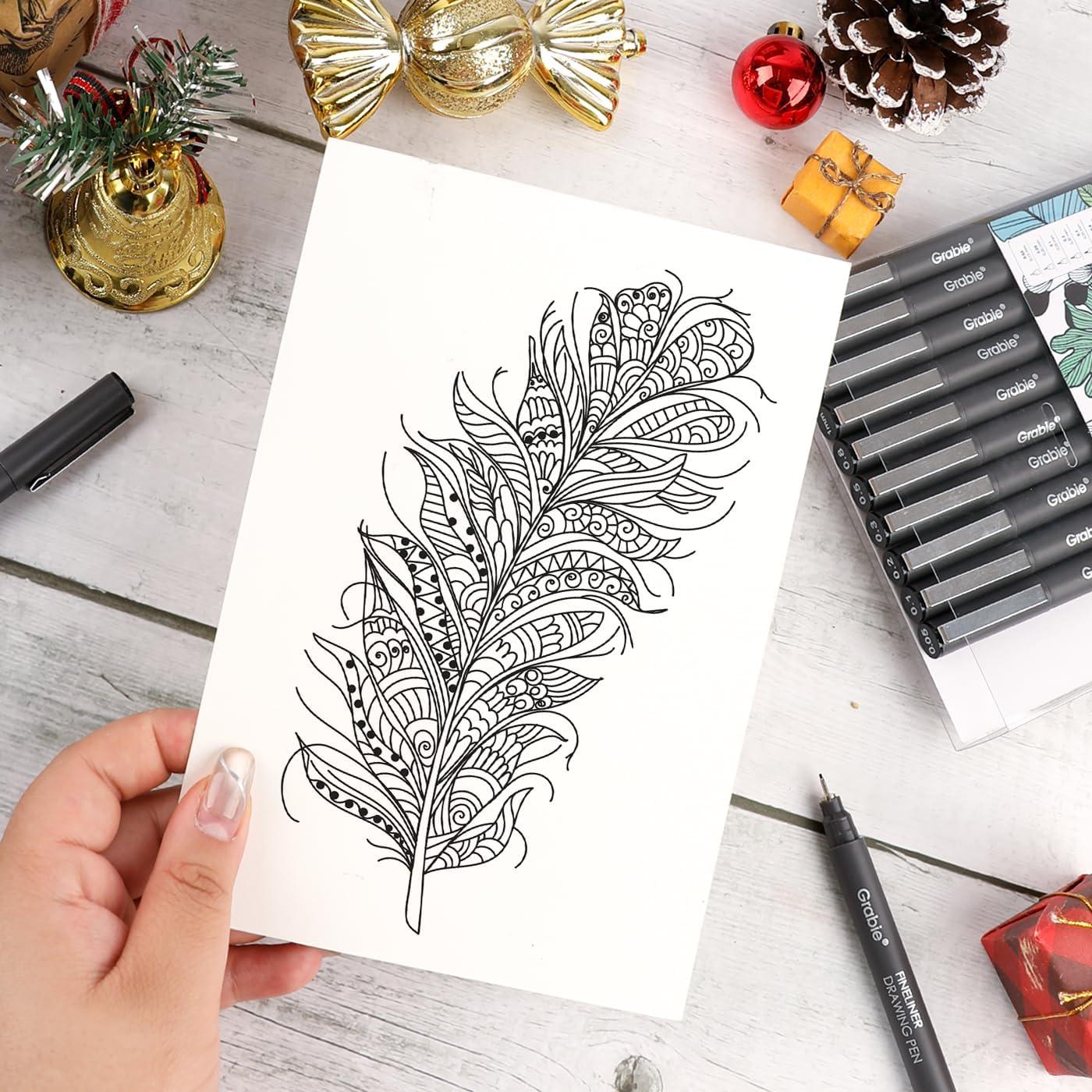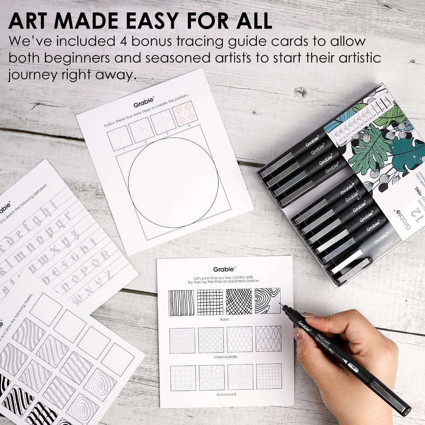 AN IDEAL GIFT FOR ARTISTS OF ALL LEVELS – This 12-piece Fineliner black pen set offers a versatile range of nib sizes and styles, perfect for precise writing, sketching, and drawing. Featuring quick-drying, water-resistant, and archival-quality pigment ink, these pens ensure vibrant, smudge-free, and long-lasting results. Safe, non-toxic, and paired with 5 bonus tracing guide cards, this set is ideal for artists of all levels to confidently explore their creative journey.