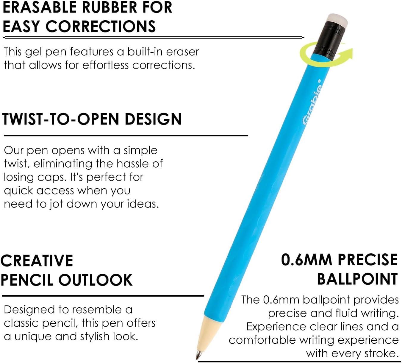 USER-FRIENDLY DESIGN – Grabie’s erasable gel pens feature a user-friendly design that mimics the familiar feel of a pencil, making them approachable for everyone. The convenient twist-to-open function allows for quick access to different colors, eliminating the hassle of lost caps and ensuring you're always ready to jot down ideas. The integrated pen eraser allows you to correct mistakes easily—an ideal ink eraser pen for students and creatives alike.