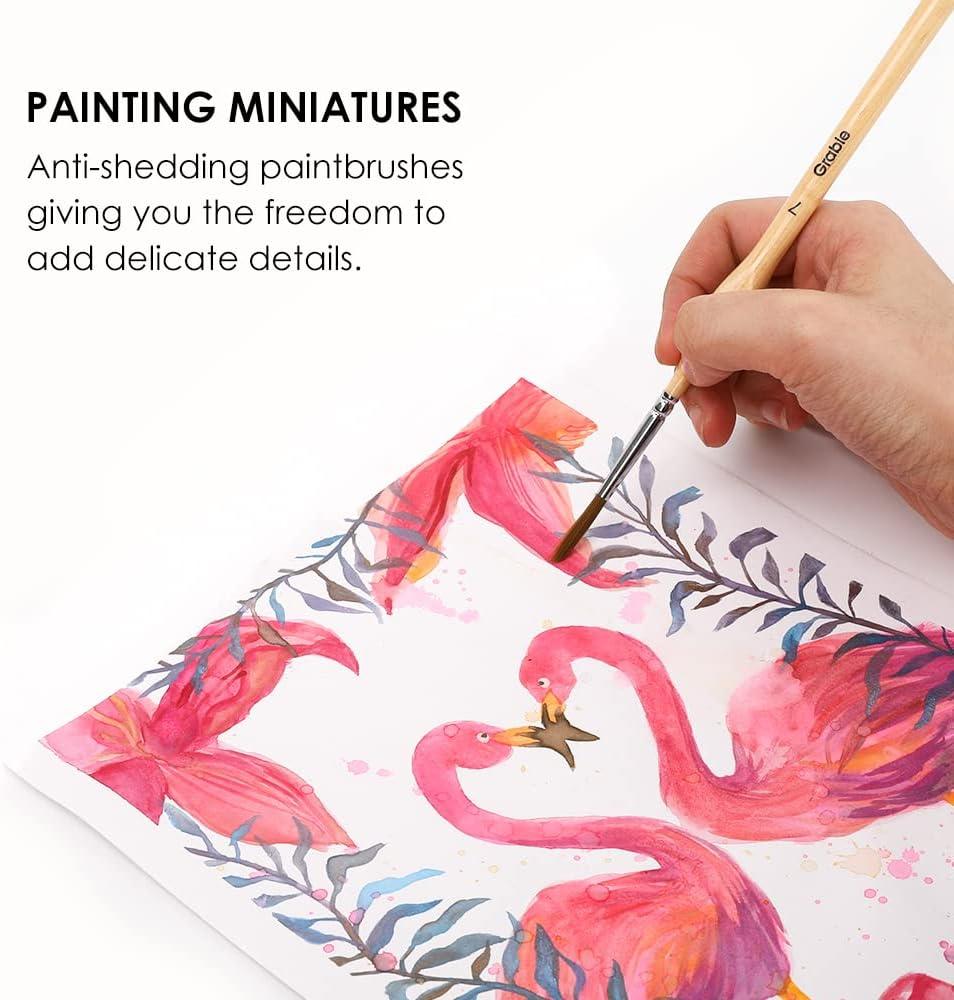 MINIATURE DETAIL PAINTING ART BRUSHES – SET OF 11 (Rounds 5/0, 3/0, 2/0, 0, 1, 2, 3, 4, 5, 6, 7)FUNCTIONS:Ideal for art detailing works on canvas, pottery, ceramics, and crafts, rocks, boards, leathers, gesso and various surfaces.Great for wildlife, botanical, portraiture, doll, illustrations, miniature, model ships and airplanes or body, nail and face art painting.Acrylic, watercolor, gouache or oil which ever project you are creating you will have the right tool for all of your hobbies and crafts.FEATURES:Grabie detail paint brushes handle is made of natural wood and designed in easy-grip triangular shape, making you feel comfortable and secure while holding it for art painting. These art paintbrushes tip is made of high-quality nylon hair which is soft and flexible, sturdy enough not easy to bend or split with pressure, trimmed and shaped neatly, no strands stick out.All the artist brushes set of miniature paintbrushes are handmade and are secured with high-quality chrome plated copper ferrules, offering excellent liquid holding capacity that results in an easy, consistent smooth flow of best paint.CAUTINONS:Clean these detail paint brushes immediately after use.Avoid scrubbing during cleaning, clean them with warm soapy water.Do not use hot water, cause it may cause any remaining paint to clot.MAINTENANCE:When cleaning, water based paint use warm soapy water, oil solvent based paints use petroleum essence.You do have to get them in water quickly after use or they stiffen up, but be sure to never leave them in water.Dry them well, store them vertically—bristles UP—in a jar or mug or any container. Keep them out of direct sunlight.COMMITMENT:If you are not satisfied with golden maple detail paint brush, just contact us and we'll send you a replacement one straight away.